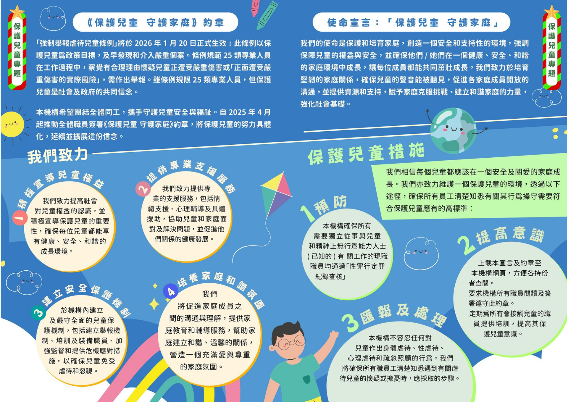 本機構不容忍任何對兒童作出身體虐待、性虐待、心理虐待和疏忽照顧的行為,我們將確保所有職員工清楚知悉遇到有關虐待兒童的懷疑或擔憂時,應採取的步驟。