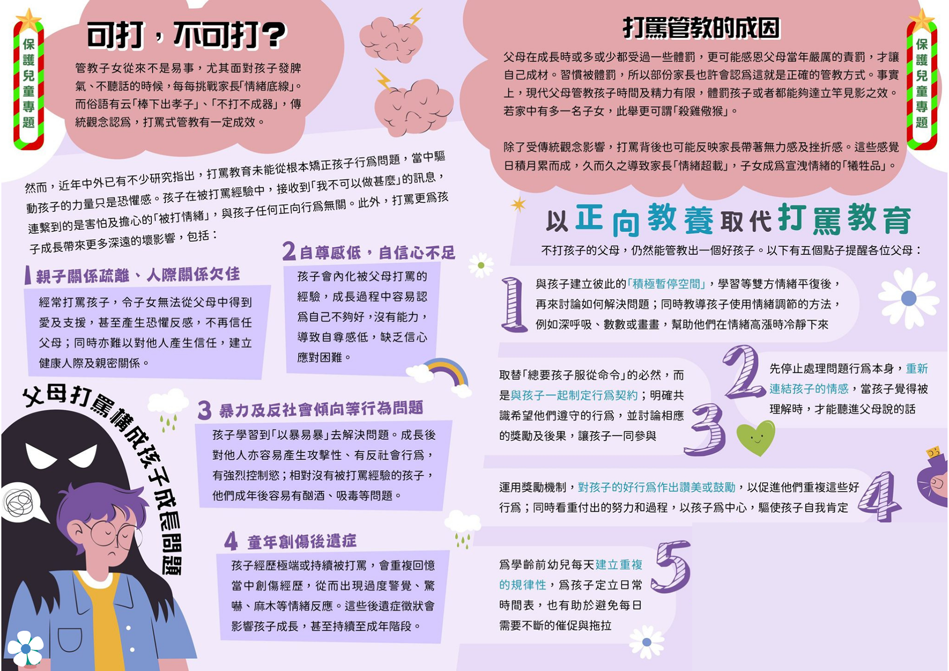 - 向兒童作出任何構成身體傷害/虐待的體罰,或利用體罰、羞辱、恫嚇或威脅的方式處理兒童的紀律或管理行為。