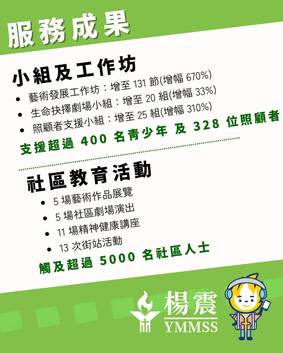 透過小組及工作坊,共支援超過 400 名青少年 及 328 位照顧者 ; 同時通過社區教育活動觸及超過 5000 名社區人士,致力推動精神健康教育。