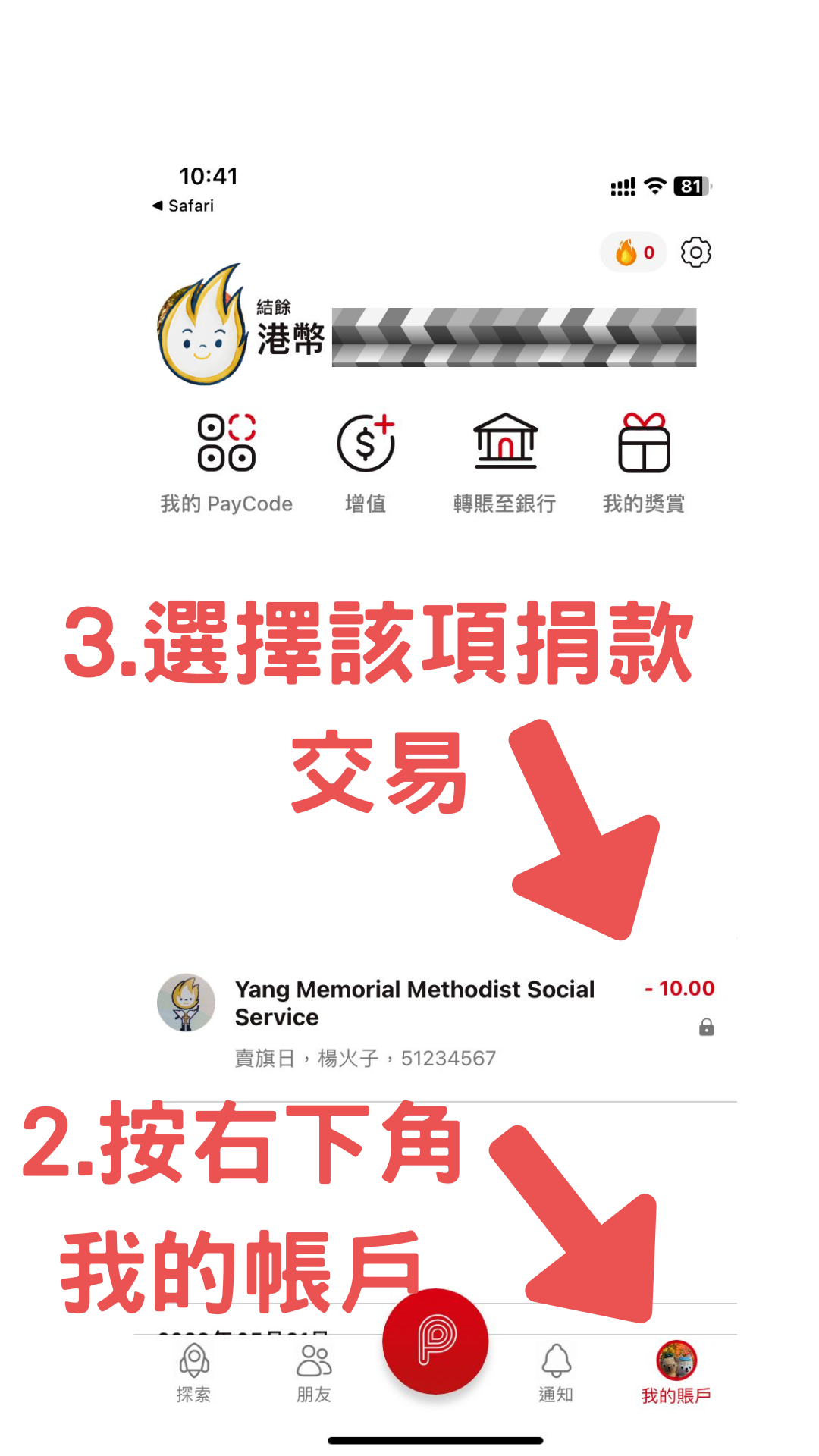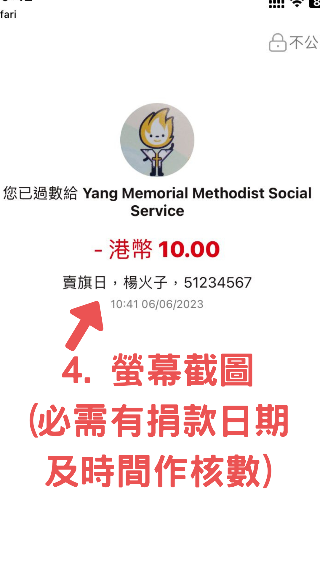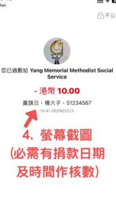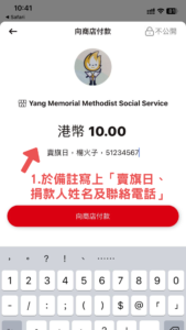 可以掃瞄PayMe Code 或按此進行捐款,備註寫上「賣旗日、捐款人姓名及聯絡電話」,螢幕截圖(請看下圖教學後連同收取金旗套裝地址電郵至flagday@yang.org.hk。