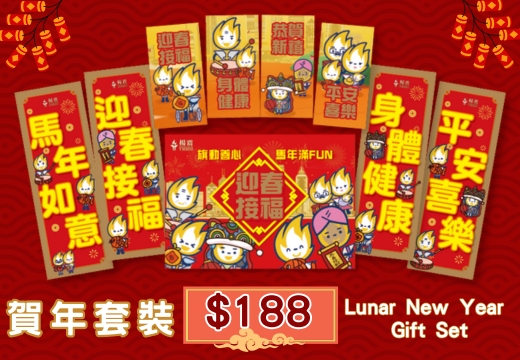 捐款港幣$188或以上,可獲「金旗賀年套裝」乙份,內附:金旗1張、揮春4個、利是封4個